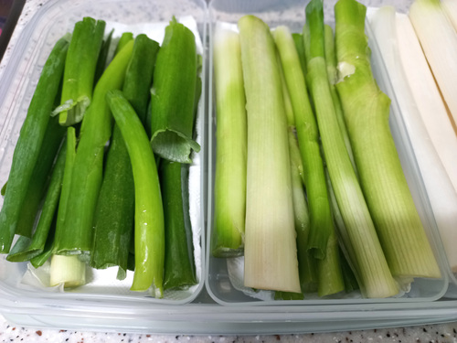 파의 흰부분, 중간, 끝부분을 나눠 담았어요. 이렇게 담아두면 필요한 부분만 골라 사용하기 쉬워요.