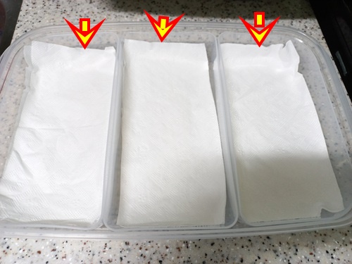 이제 중요한 팁 한가지 더 ... 대파를 넣기 전에 키친타월을 깔아 줍니다.