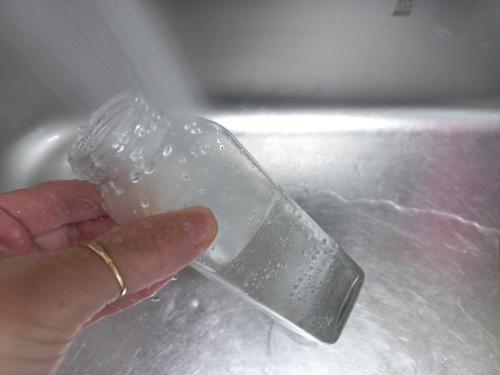 병을 흔들면 기름병에 있던 물이 뿌옇게 되는데요. 이 상태가 되면 기름병에 묻은 기름이 제거되는 상태랍니다.