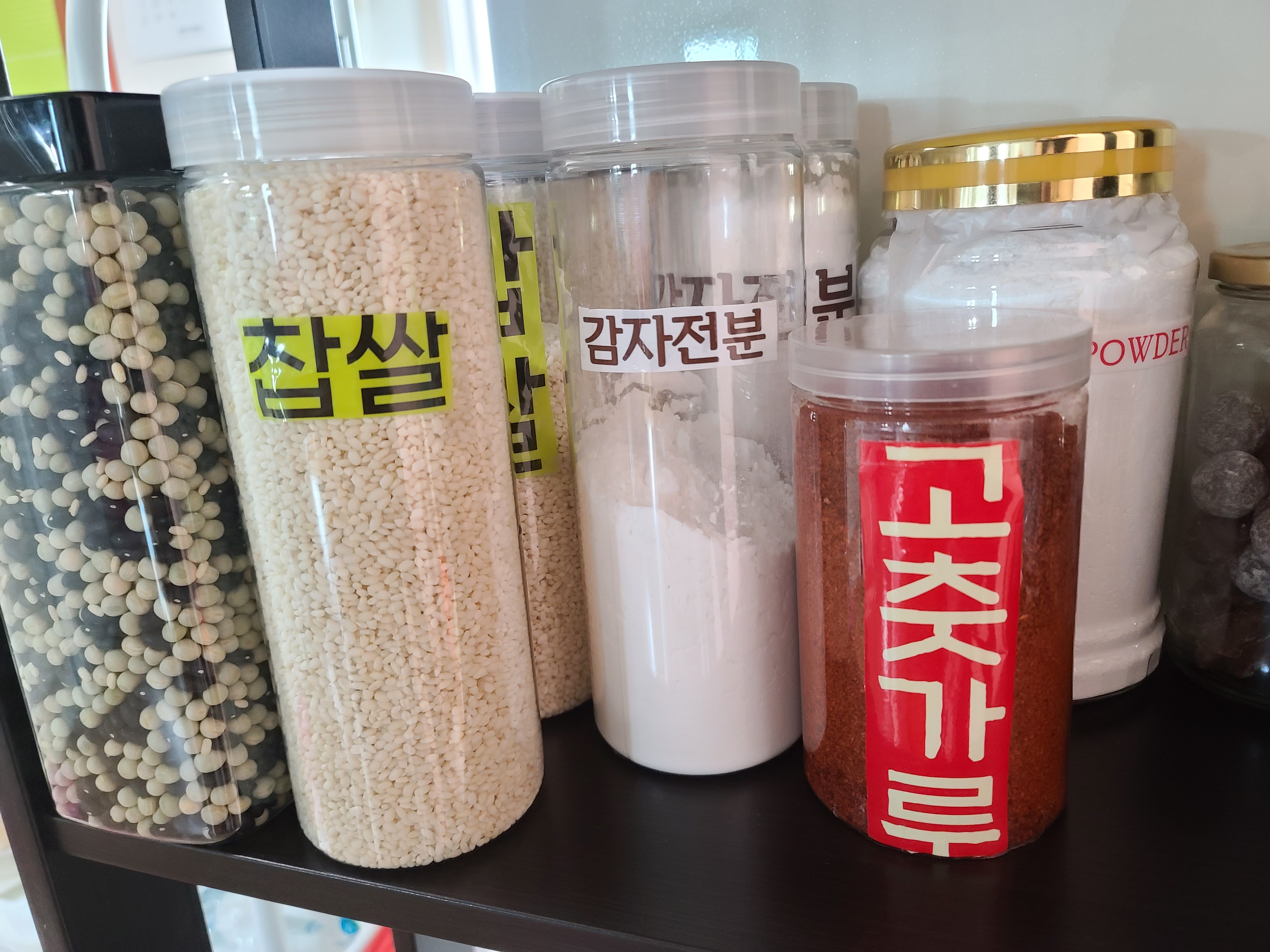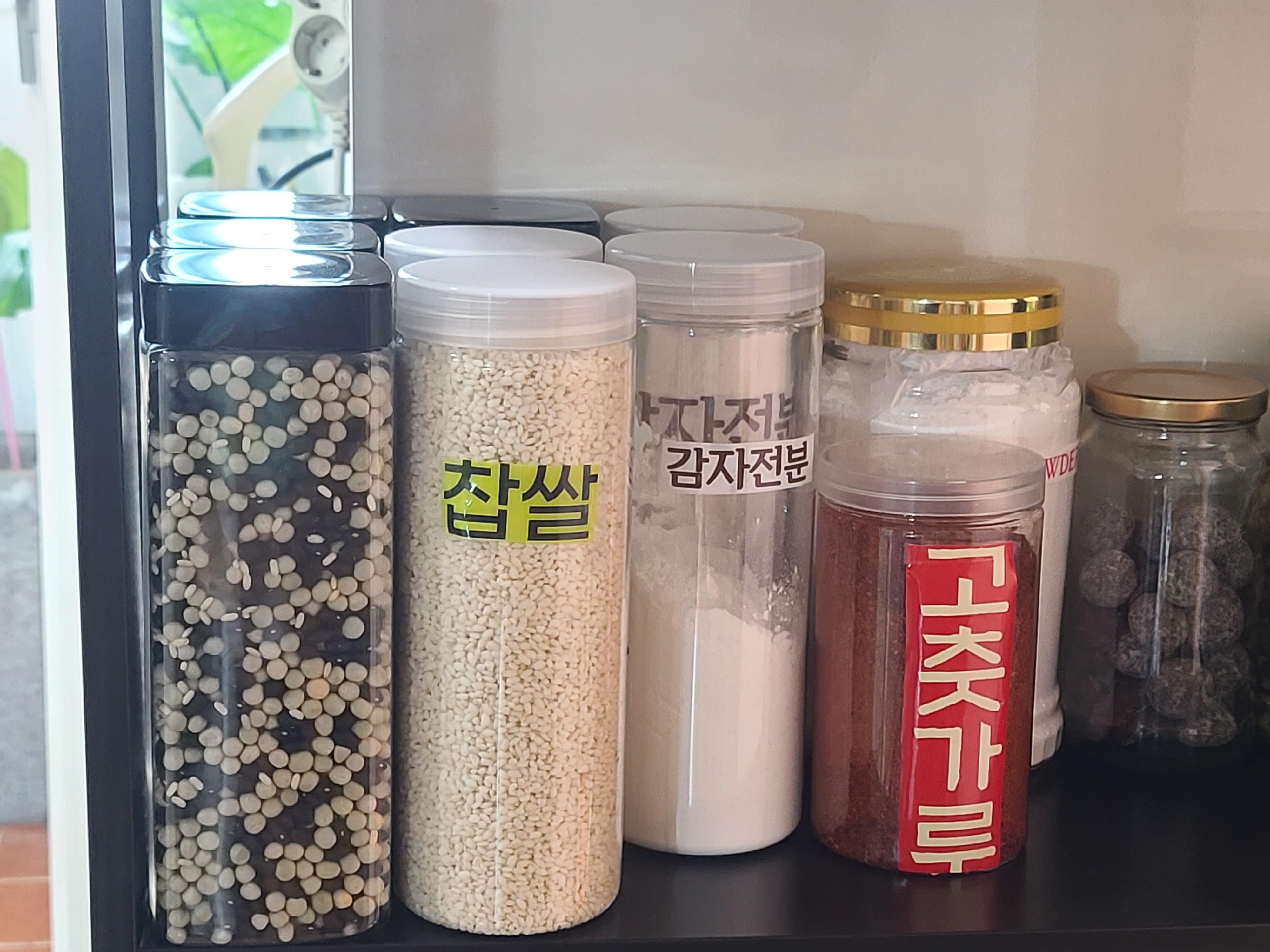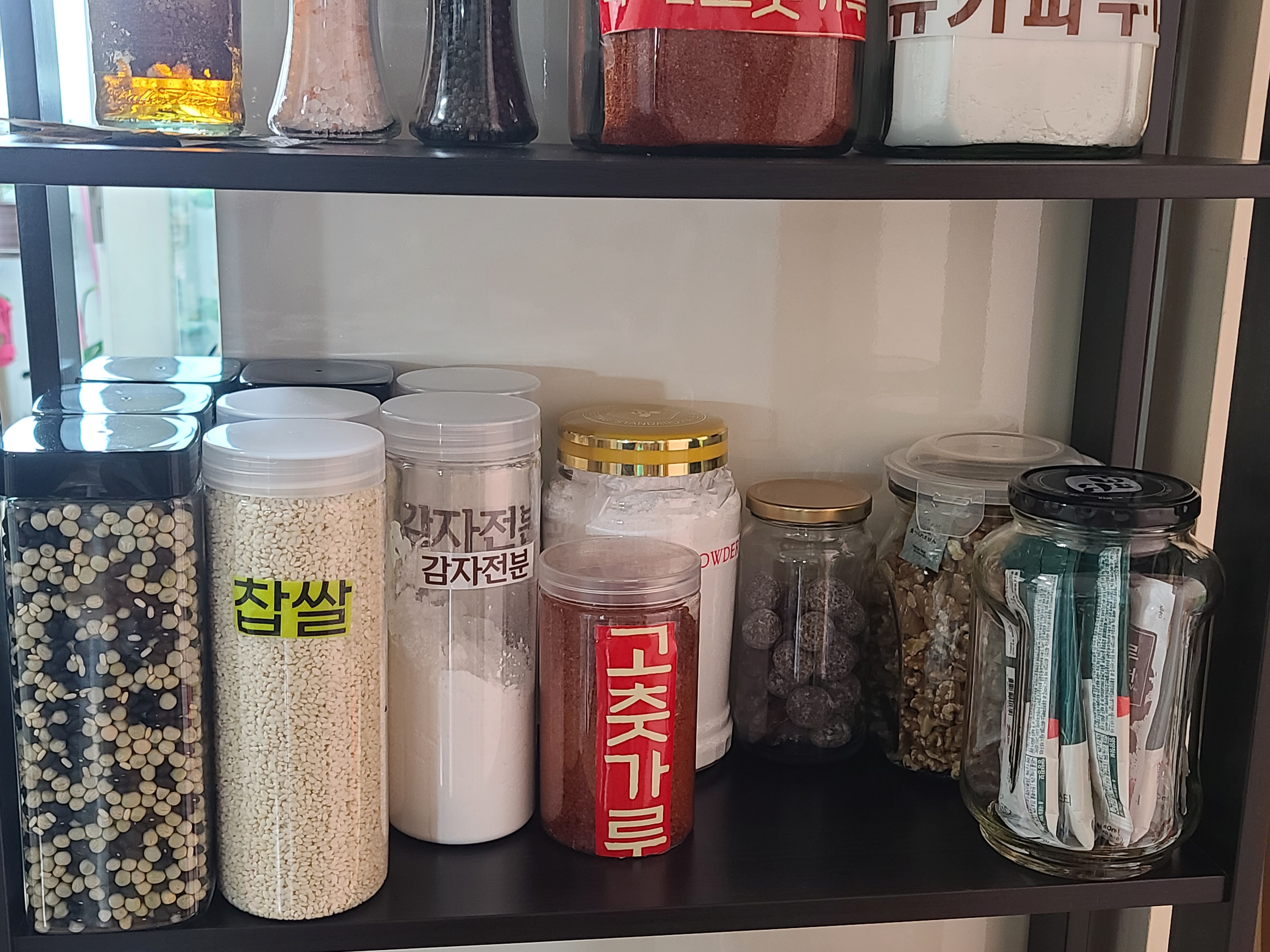 그리고 통에 담아 놓은 식재료에 잘라 놓은 상표를 스카치테이프를 이용해 붙여두니 훨씬 눈에 잘 띄고 나름대로 찾기가 더 쉬워졌다.