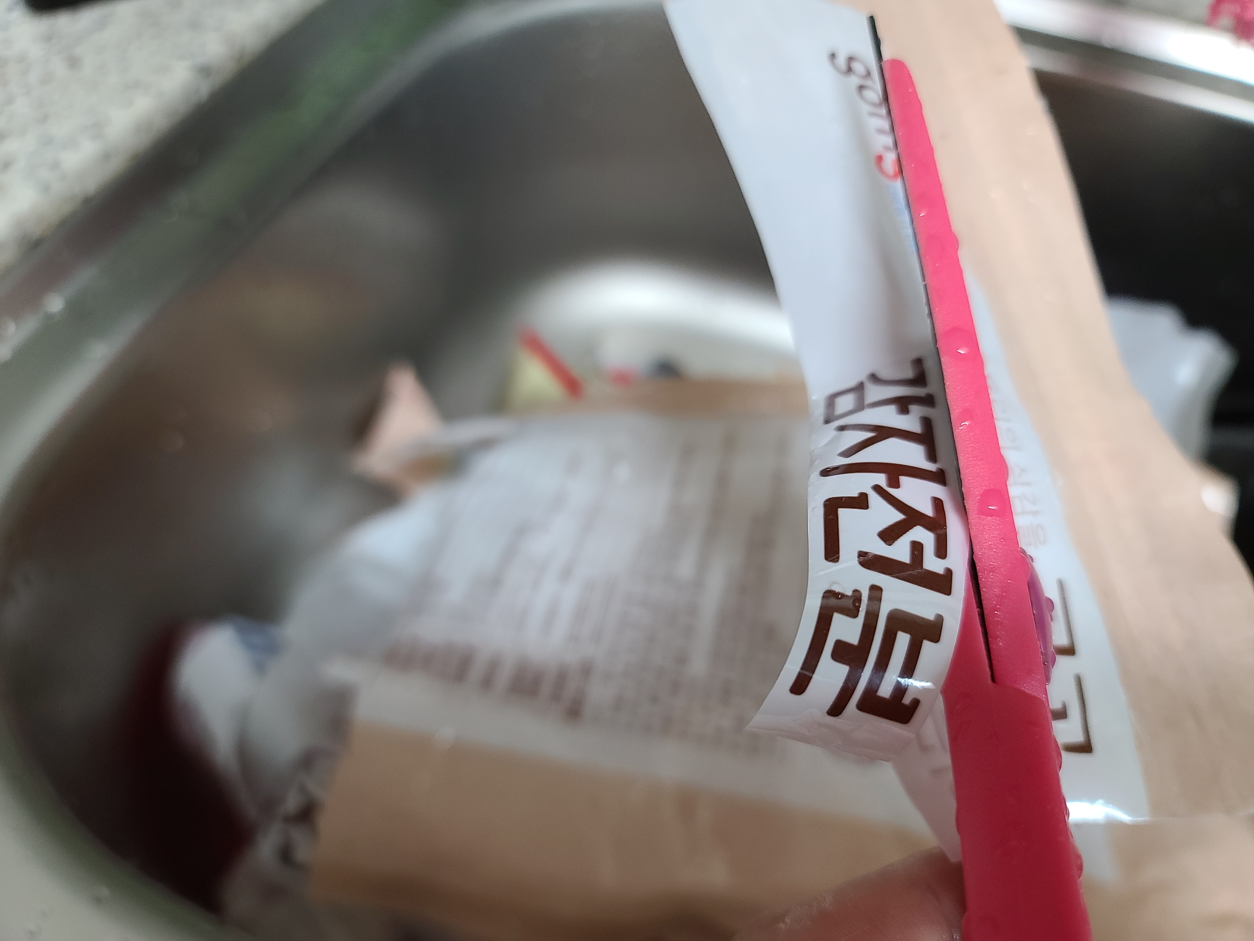 깨끗이 씻은 상표를 가위로 반듯하게 잘라서 마른 수건으로 닦았다.