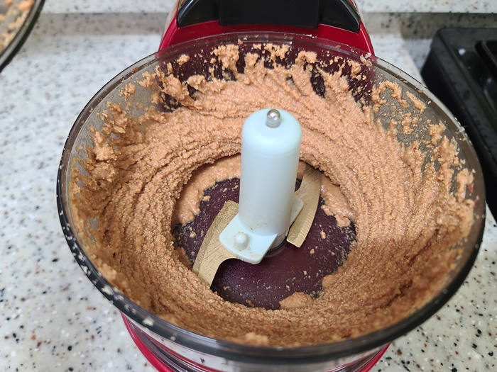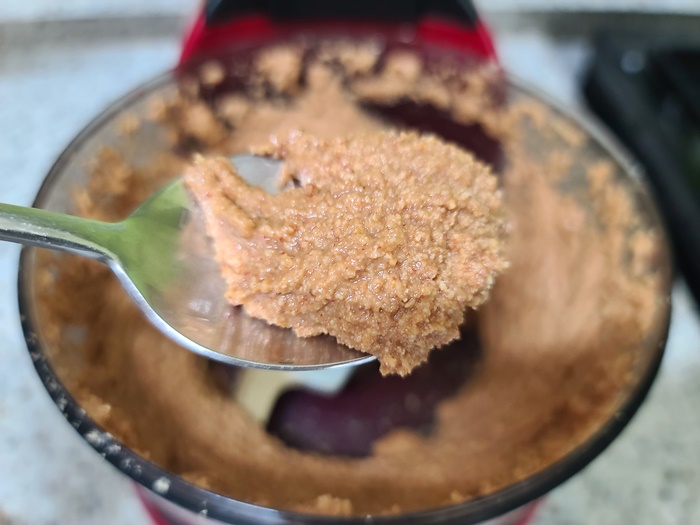 분쇄기로 30초 정도 돌리면 아래 사진처럼 엄청 곱게 갈아진 모습인데요. 이 상태에서 올리브오일을 넣어 10초~ 20초 정도 돌려주면 시중에 파는 땅콩버터의 모습이 됩니다.