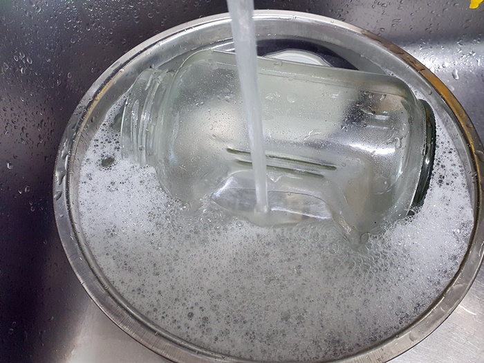 주방세제가 담긴 물에 담근 유리병은 이 상태로 1시간 정도 방치해 줍니다.