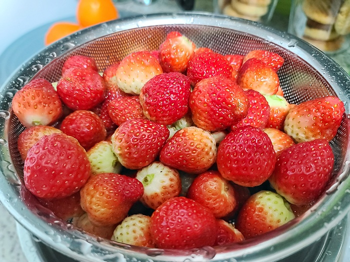 딸기 씻는 법은 먼저꼭지를 제거해 둡니다. 칼로 자르지 말고 손으로 꼭지만 손으로 '똑' 뜯으세요. 그 다음은 물에 담궈서 1분 정도 둔 뒤 흐르는 물에 재빨리 씻어주면 됩니다. 너무 많이 물에 담궈두면 물러지기 쉬워요.