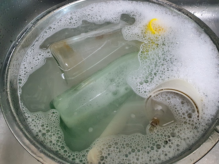 그 다음은 주방세제를 조금 풀어서 온수에 잠깐만 담궈 주세요. 전 5분 정도 담궜어요.