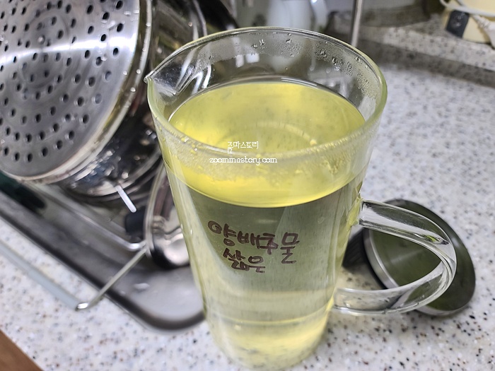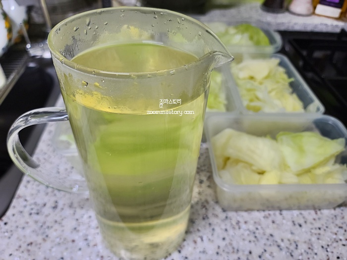 유리병에 양배추 삶은 물을 담아 두고 식혀서 냉장고에 넣어 둘거예요. 나름대로 양배추에서 나 온 영양소가 많은데 그냥 버리면 안 될 것 같아서 전 늘 이렇게 요리에 활용하고 있답니다.