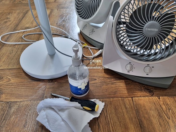 일반 선풍기와 달리 서큘레이터는 생각보다 까다롭긴 해요. 일일이 분리가 안 되는 단점으로 인해 꼭 필요한 청소용품이 있어요. 그건 바로 손소독제입니다. 분리가 안되는 날개나 뒷면은 손소독제를 이용해 닦아 주는 방식으로 청소를 시작하면 됩니다. 참고로 분리할 때는 드라이버도 필요해요.