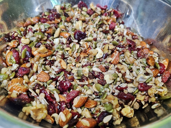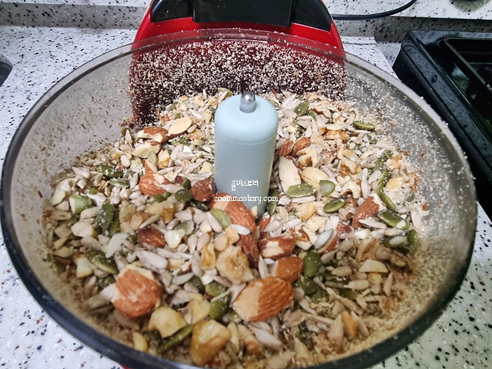 견과류는 먹기 좋은 크기로 다져 준다. 칼로 다지면 더 좋겠지만 난 그냥 기계의 힘을 빌렸다. 다진 견과류에 남은 재료를 다 넣어 섞는다. 단, 건베리류는 나중에 넣는 걸 권한다. 난 처음에 넣었다가 식감이 없을 정도로 바삭하게 익어버려서 아쉬웠음...