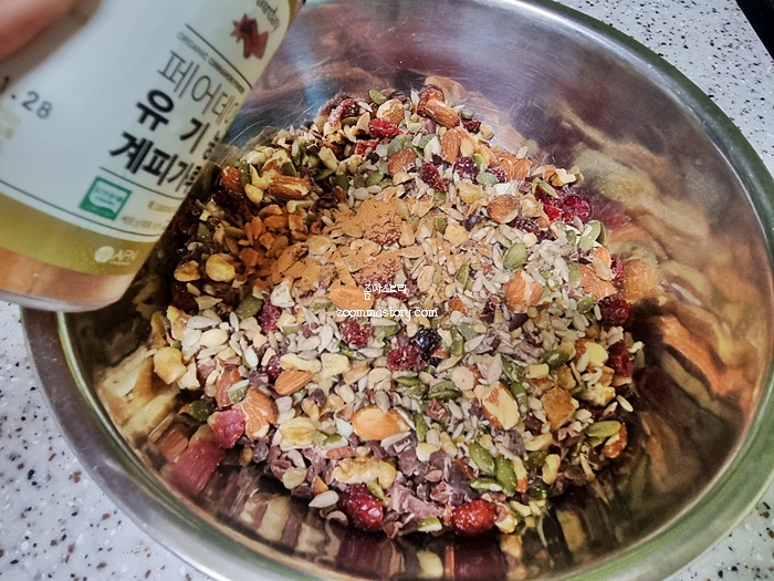 섞어 놓은 견과류에 계피가루를 넣어 섞어준다. 보통은 시나몬 가루를 넣긴 하는데 난 계피 특유의 향이 좋기도 하고 몸에도 좋으니 이것으로 선택했다. 물론 이것도 남아 있던 것이었기에 사용하기로 했다.