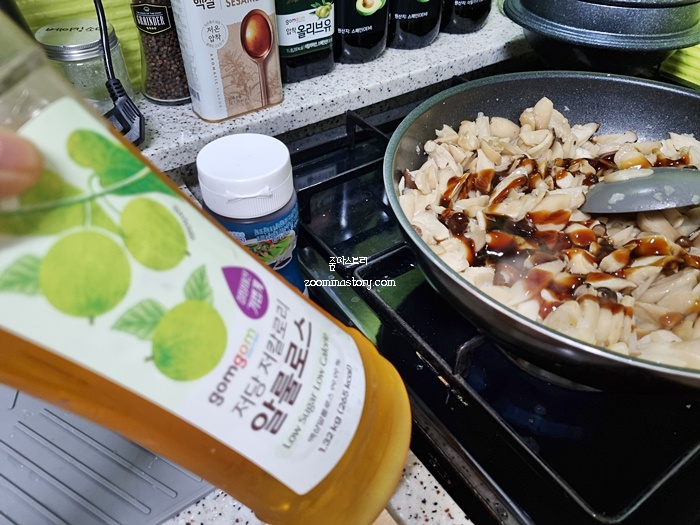 냉동되어 있던 새송이는 해동 후 물기를 꽉 짜서 제거해 준 뒤 요리한다. 프라이팬에 제일 먼저 간마을과 오일을 넣고 볶은 후에 새송이 버섯을 넣고 같이 볶아 준다. 그리고 난 뒤 양념을 넣어 졸여준다.